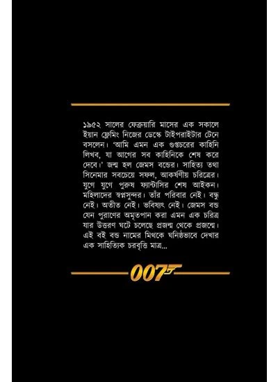 ১৯৫২ সালের ফেব্রুয়ারি মাসের এক সকালে ইয়ান ফ্লেমিং নিজের ডেস্কে টাইপরাইটার টেনে বসলেন। ‘আমি এমন এক গুপ্তচরের কাহিনি লিখব, যা আগের সব কাহিনিকে শেষ করে দেবে।’ জন্ম হল জেমস বন্ডের। সাহিত্য তথা সিনেমার সবচেয়ে সফল, আকর্ষণীয় চরিত্রের। যুগে যুগে পুরুষ ফ্যান্টাসির শেষ আইকন। মহিলাদের স্বপ্নসুন্দর। তাঁর পরিবার নেই। বন্ধু নেই। অতীত নেই। ভবিষ্যৎ নেই। জেমস বন্ড যেন পুরাণের অমৃতপান করা এমন এক চরিত্র যার উত্তরণ ঘটে চলেছে প্রজন্ম থেকে প্রজন্মে এই বই বন্ড নামের মিথকে ঘনিষ্ঠভাবে দেখার এক সাহিত্যিক চরবৃত্তি মাত্র…